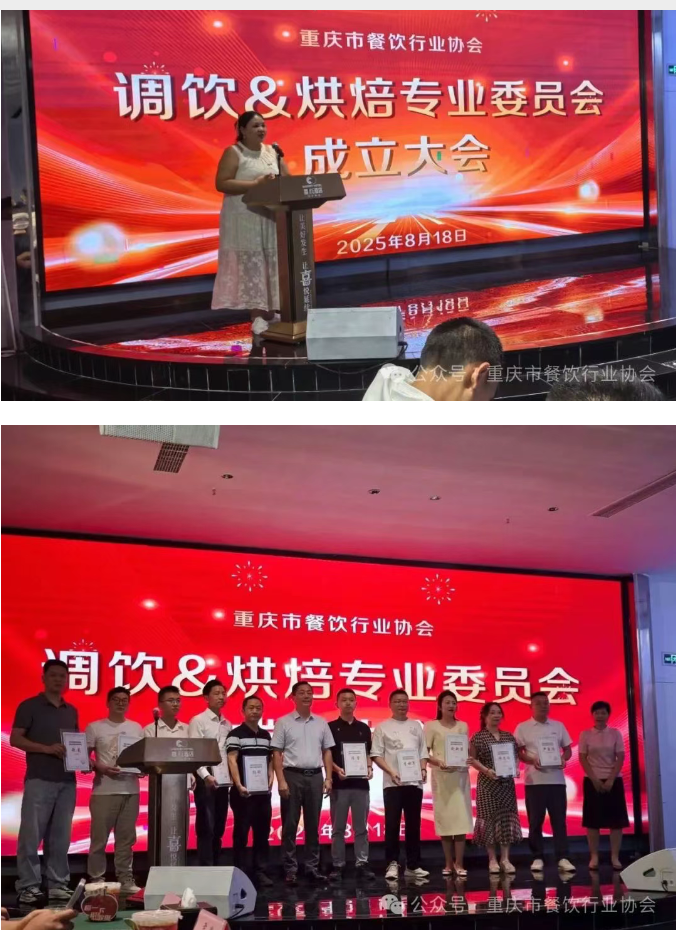 重庆市餐饮行业协会调饮烘焙专委会成立大会圆满举行重庆市餐饮行业协会调饮烘焙专委会成立大会圆满举行 ——聚力创新谋发展 匠心传承谱新篇 8月18日,重庆市餐饮行业协会调饮烘焙专委会成立大会在喜悦美好婚宴江北店隆重召开。本次大会以“融合创新·匠心传承·共促发展”为主题,汇聚行业精英、专家学者及企业代表,共同见证重庆调饮烘焙行业迈向专业化、标准化、创新发展发展的新起点。